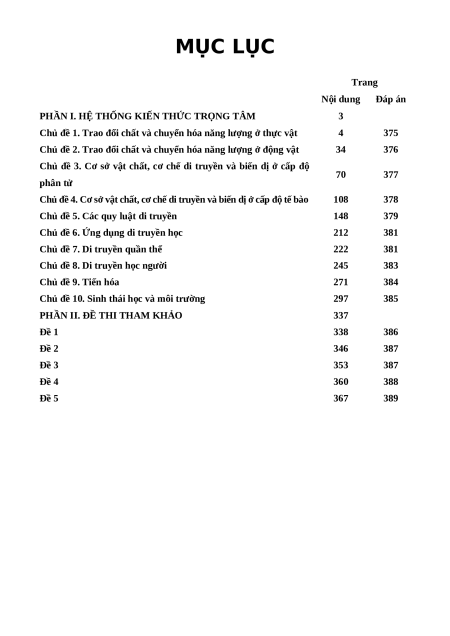 CHỦ ĐỀ ÔN THI TỐT NGHIỆP SINH HỌC MỤC LỤC Trang Nội dung Đáp án