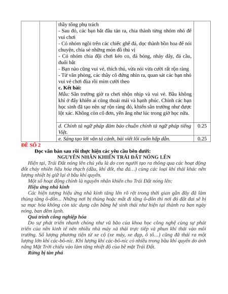 e. Sáng tạo lời văn tả cảnh, bài viết lôi cuốn hấp dẫn. 0.25 ĐỀ SỐ 2