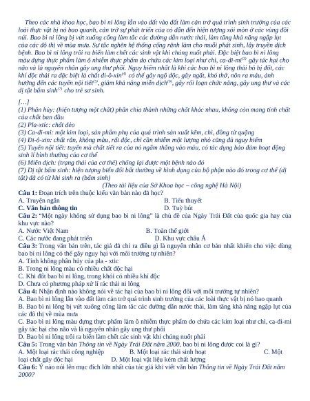 Câu 6: Ý nào nói lên mục đích lớn nhất của tác giả khi viết văn bản Thông tin về Ngày Trái Đất năm 2000?