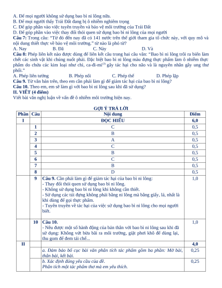 Bác đến chơi đây ta với ta. (Nguyễn Khuyến) GỢI Ý TRẢ LỜI Phần Câu Nội dung Điểm I ĐỌC HIỂU 6,0 1 C 0.5 2 B 0.5 3 D 0.5 4 A 0.5 5 B 0.5 6 B 0.5 7 A 0.5 8 D 0.5 9