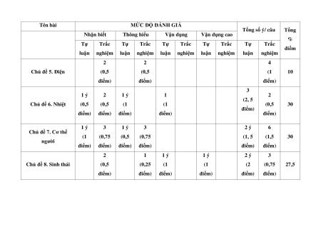MỨC ĐỘ ĐÁNH GIÁ Tổng số ý/ câu Tổng Nhận biết Thông hiểu Vận dụng Vận dụng cao % Tự Trắc Tự Trắc Tự Trắc Tự Trắc Tự Trắc điểm luận nghiệm luận nghiệm luận nghiệm luận nghiệm luận nghiệm 2 2 4 Chủ đề 5. Điện (0,5 (0,5 (1 10 điểm) điểm) điểm) 3 1 ý 2 1 ý 1 2 (2, 5 Chủ đề 6. Nhiệt (0,5 (0,5 (1 (1 (0,5 30 điểm) điểm) điểm) điểm) điểm) điểm) 1 ý 3 1 ý 3 2 ý 6