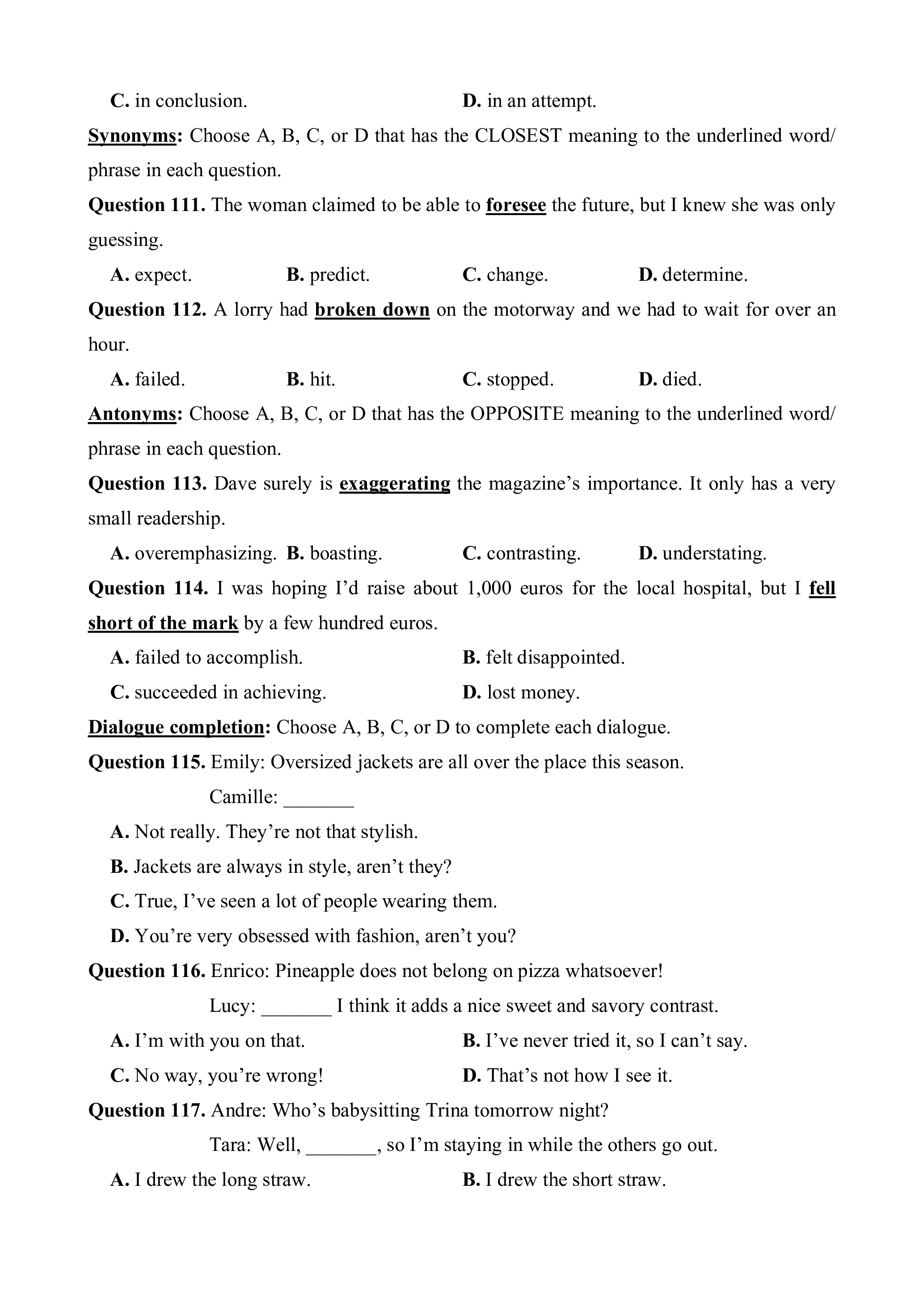 Question 111. The woman claimed to be able to foresee the future, but I knew she was only guessing. A. expect. B. predict. C. change. D. determine.