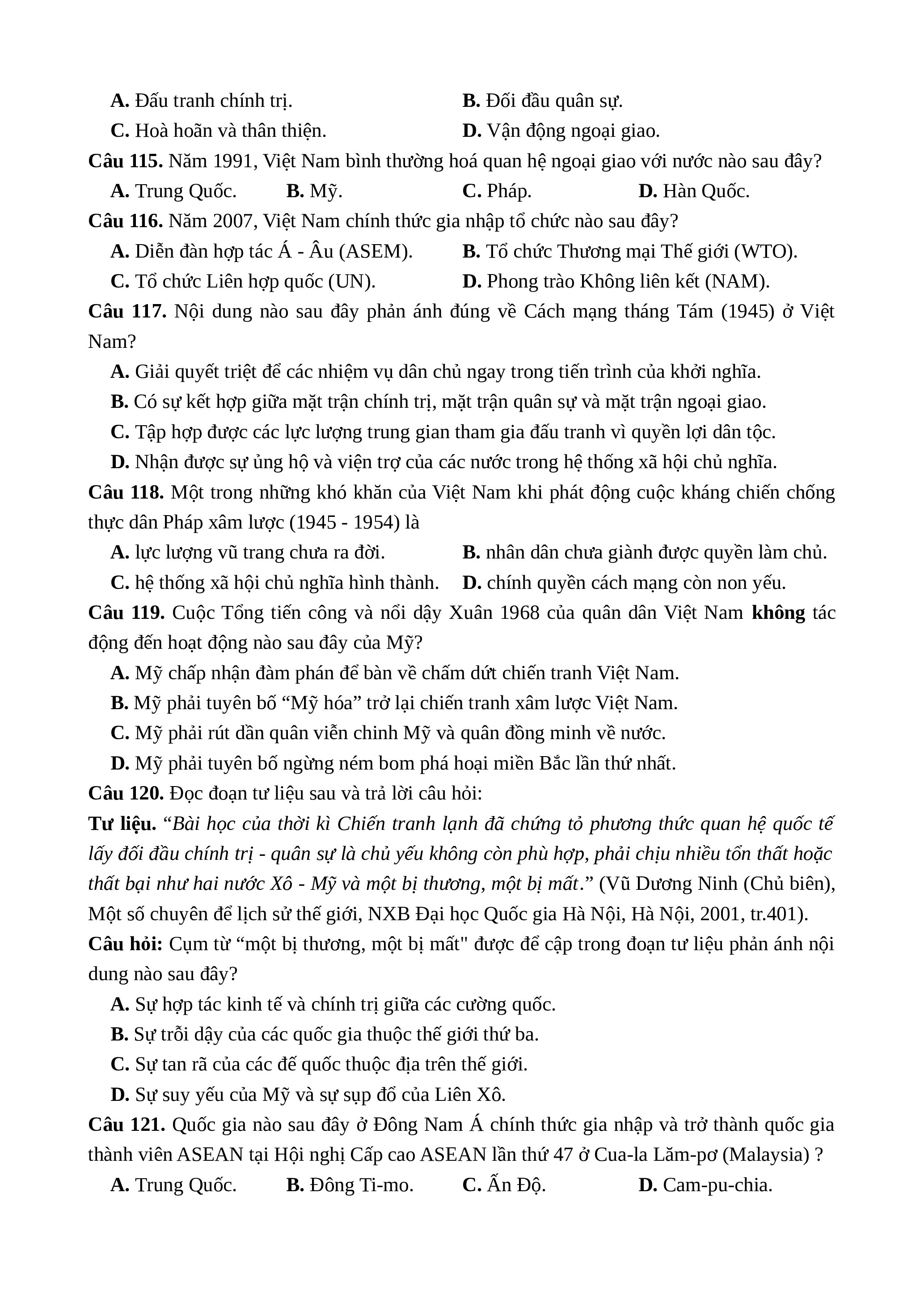 Câu 115. Năm 1991, Việt Nam bình thường hoá quan hệ ngoại giao với nước nào sau đây? A. Trung Quốc. B. Mỹ. C. Pháp. D. Hàn Quốc.