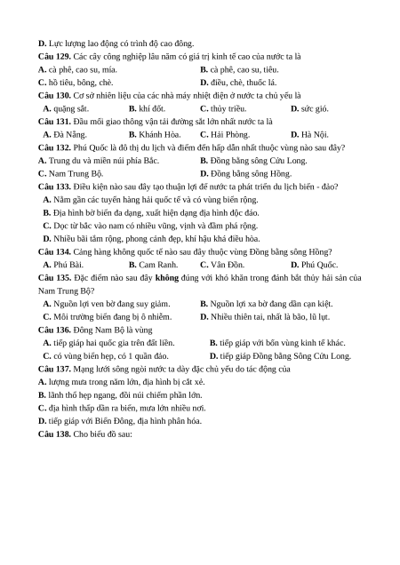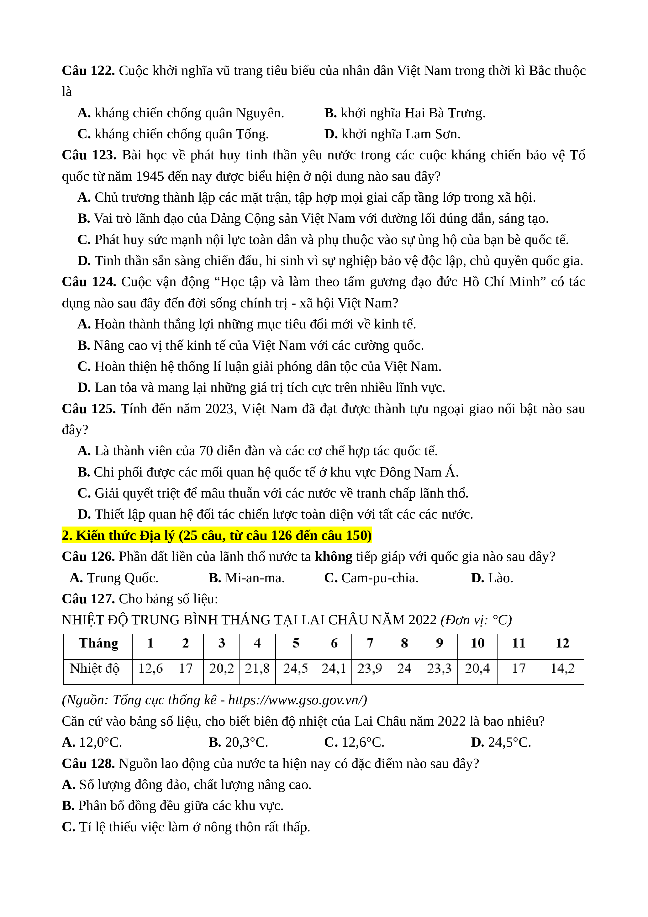 2. Kiến thức Địa lý (25 câu, từ câu 126 đến câu 150)