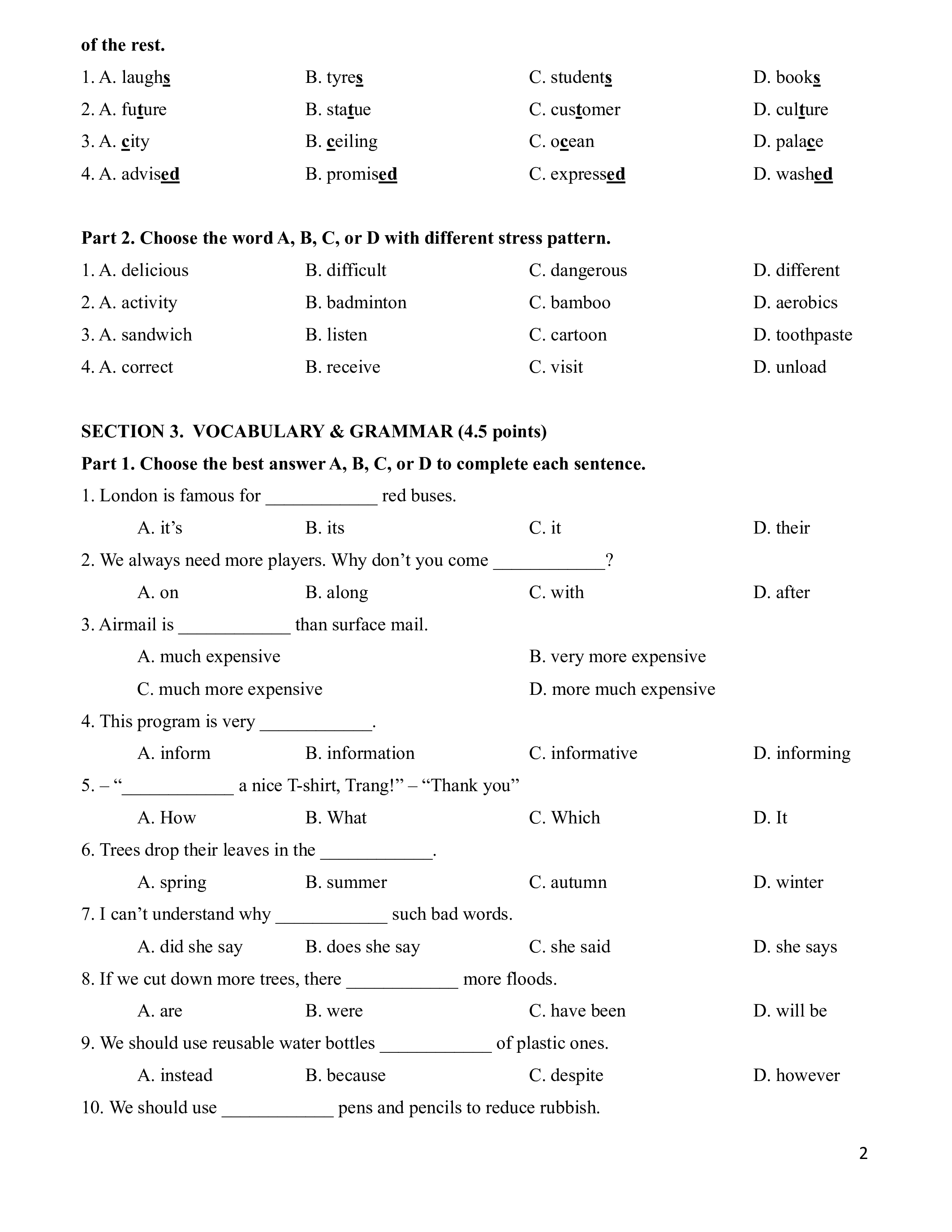 Part 2. Choose the word A, B, C, or D with different stress pattern. 1. A. delicious B. difficult C. dangerous D. different 2. A. activity B. badminton C. bamboo D. aerobics 3. A. sandwich B. listen C. cartoon D. toothpaste 4. A. correct B. receive C. visit D. unload