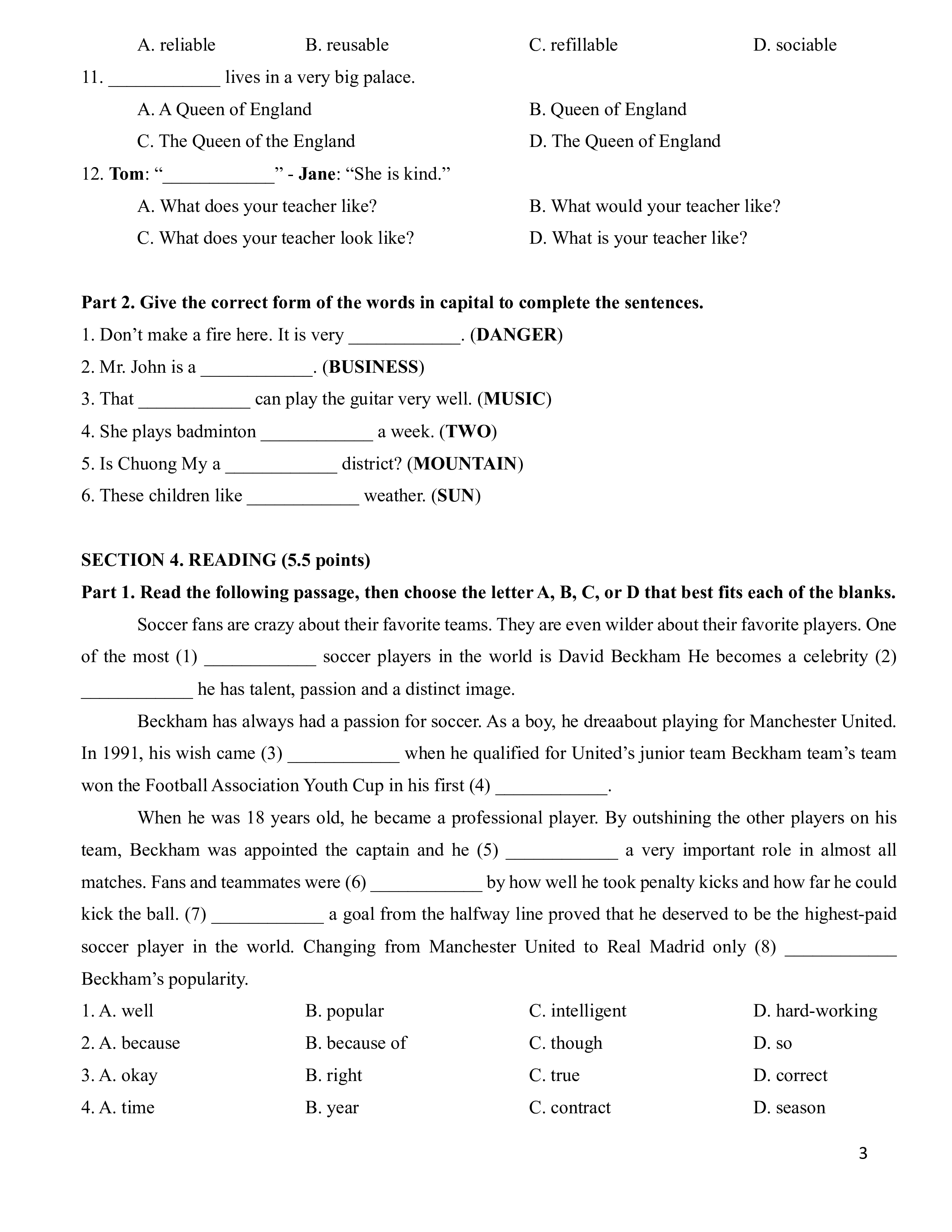 soccer player in the world. Changing from Manchester United to Real Madrid only (8) ____________ Beckham’s popularity. 1. A. well B. popular C. intelligent D. hard-working 2. A. because B. because of C. though D. so 3. A. okay B. right C. true D. correct 4. A. time B. year C. contract D. season 3 5. A. took B. did C. played D. made 6. A. amazed B. amazing C. amazement D. amazingly 7. A. Kicking B. Shooting C. Scoring D. Setting 8. A. high B. height C. highly D. heightened