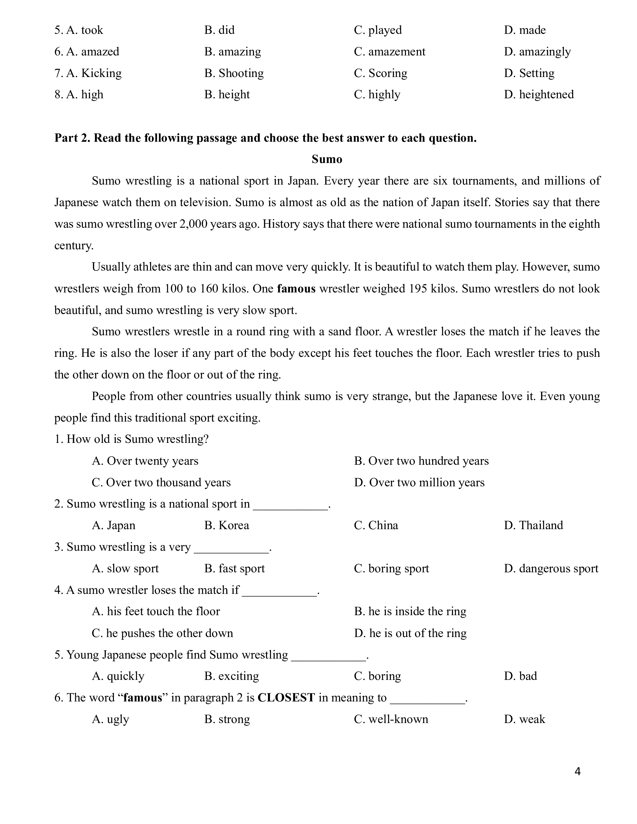 Part 2. Read the following passage and choose the best answer to each question. Sumo