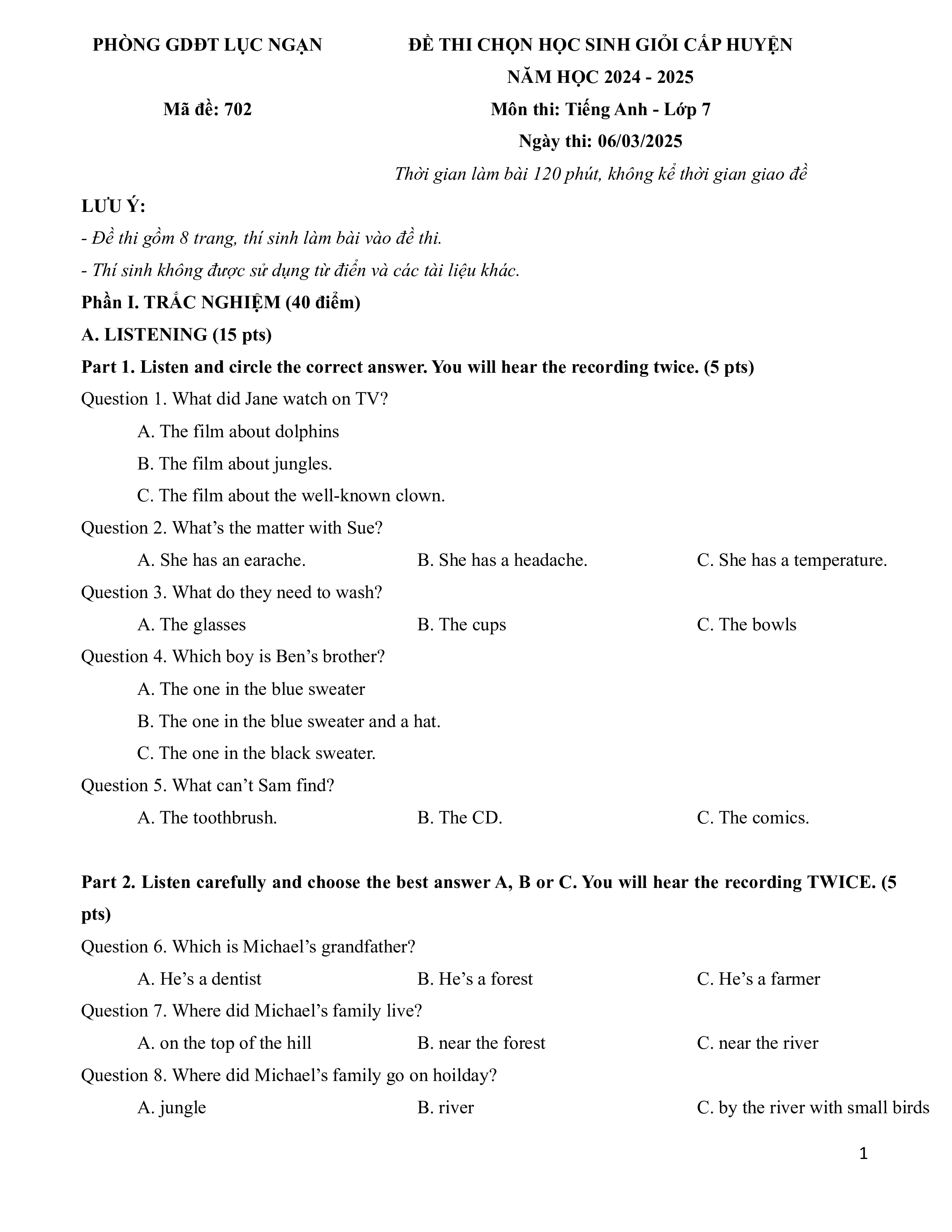 Phần I. TRẮC NGHIỆM (40 điểm) A. LISTENING (15 pts)