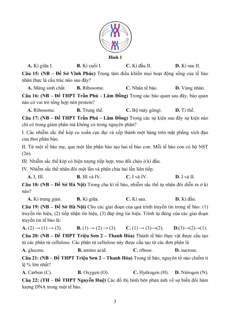 Câu 18: (NB – Đề Sở Hà Nội) Trong chu kì tế bào, nhiễm sắc thể tự nhân đôi diễn ra ở kì nào? A. Kì trung gian. B. Kì giữa. C. Kì sau. D. Kì đầu.