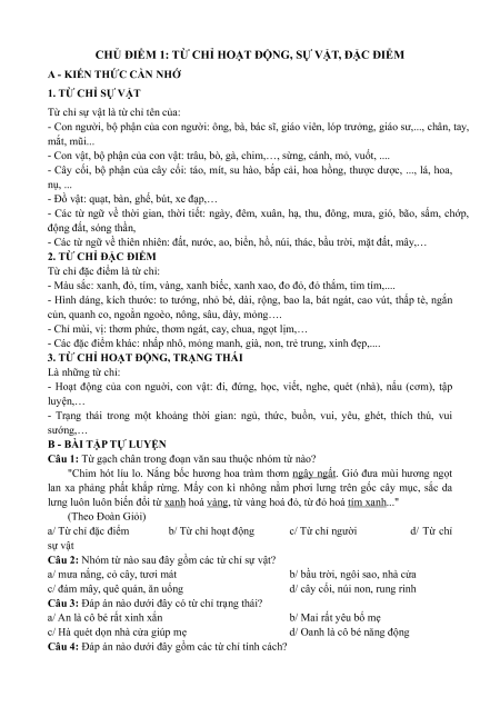 CHỦ ĐIỂM 1: TỪ CHỈ HOẠT ĐỘNG, SỰ VẬT, ĐẶC ĐIỂM
