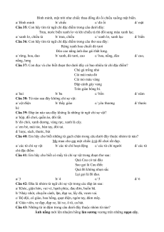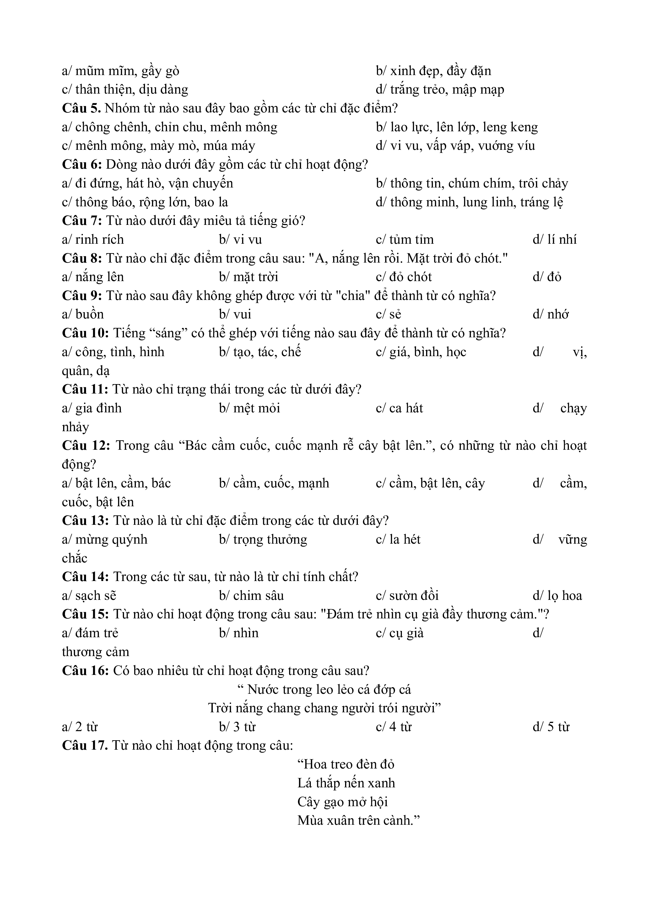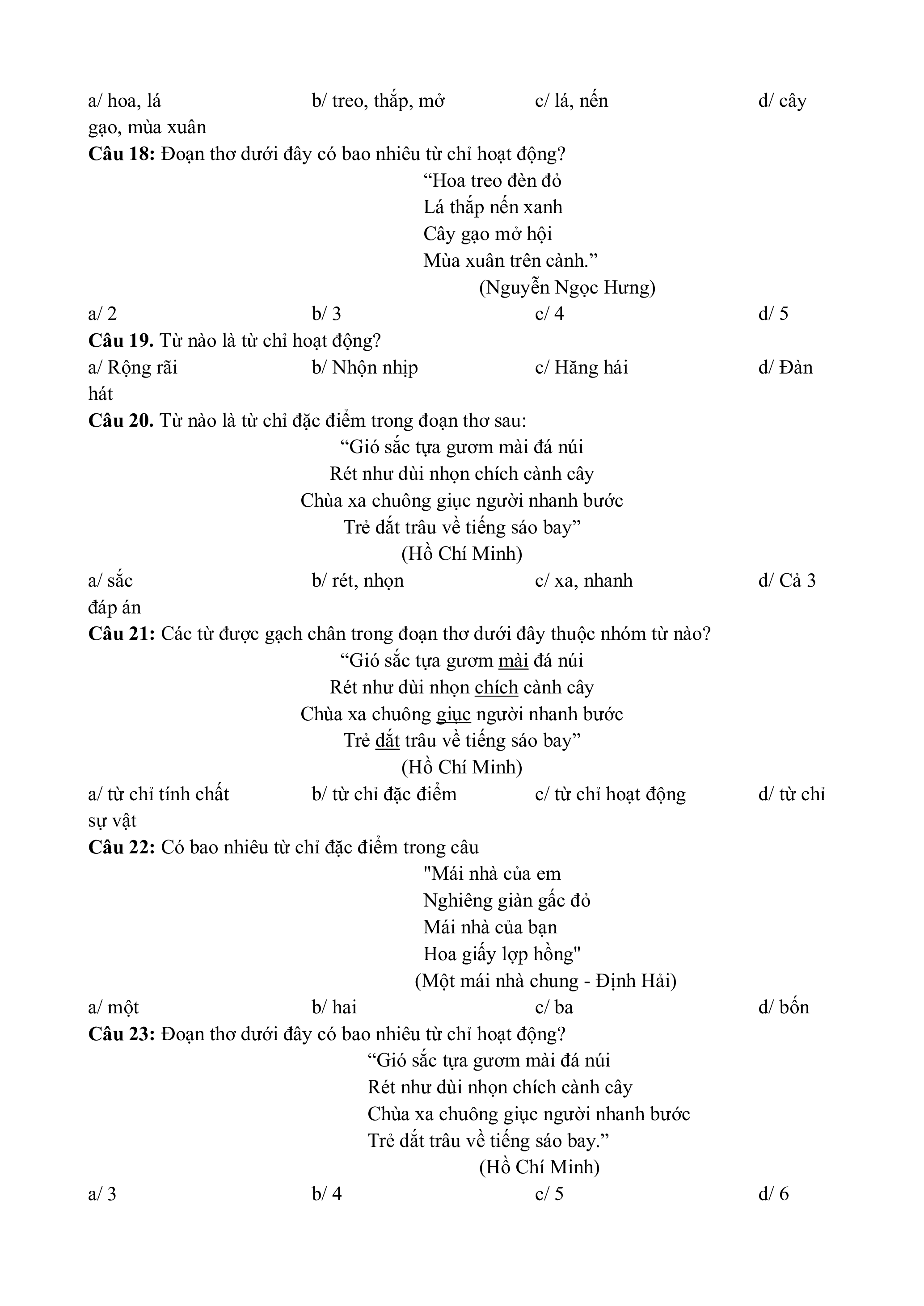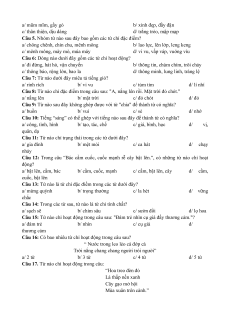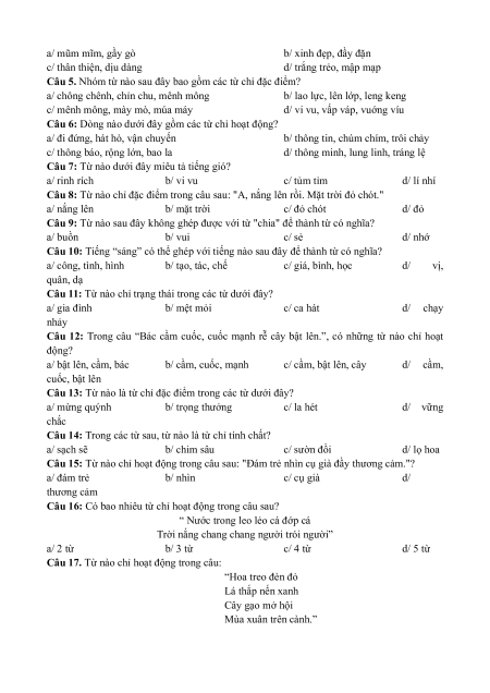 Câu 18: Đoạn thơ dưới đây có bao nhiêu từ chỉ hoạt động? “Hoa treo đèn đỏ Lá thắp nến xanh Cây gạo mở hội Mùa xuân trên cành.” (Nguyễn Ngọc Hưng) a/ 2 b/ 3 c/ 4 d/ 5