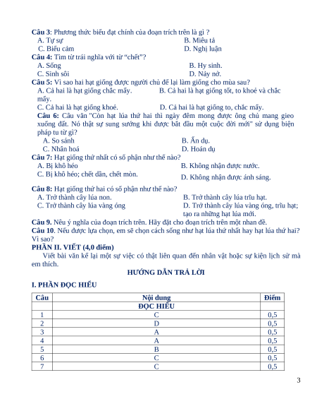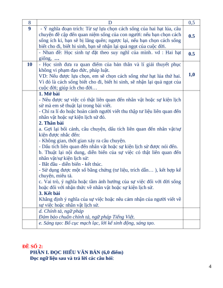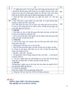 HƯỚNG DẪN TRẢ LỜI I. PHẦN ĐỌC HIỂU Câu Nội dung Điểm ĐỌC HIỂU 1 C 0,5 2 D 0,5 3 A 0,5 4 A 0,5 5 B 0,5 6 C 0,5 7 C 0,5 3 8 D 0,5 9