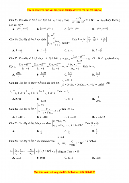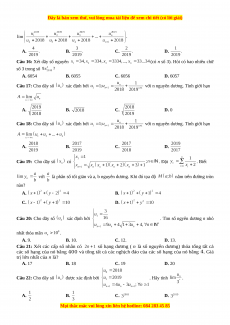 Câu 26: Cho dãy số thực tăng xác định bởi . Đặt . Tính A. 2018 B. C. 2019 D. Câu 27: Cho dãy số . Tìm . A. B. C. D. Câu 28: Cho dãy số được xác định . Tính A. 1 B. C. D. Câu 29: Cho dãy số xác định như sau: . Giả sử hạn và tối giản. Tính . A. 1012 B. 1021 C. 1015 D. 1018