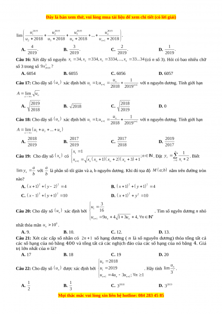 trị lớn nhất của n là? A. 17 B. 18 C. 19 D. 20 Câu 22: Cho dãy số được xác định bởi . Hãy tính . A. B. C. D.