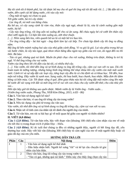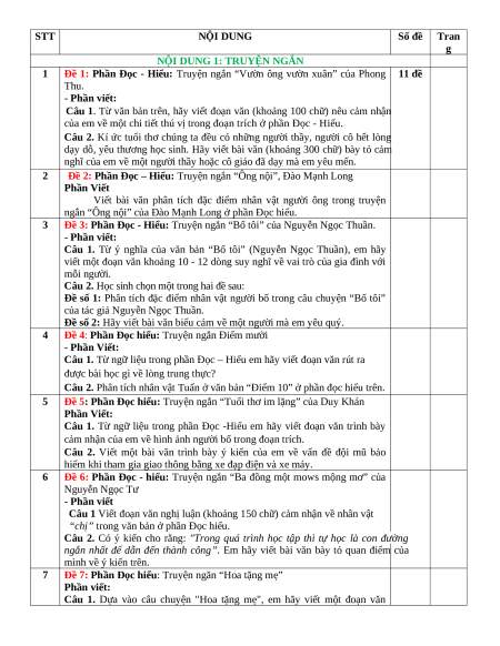 Đề 1: Phần Đọc - Hiểu: Truyện ngắn “Vườn ông vườn xuân” của Phong 11 đề Thu. - Phần viết: