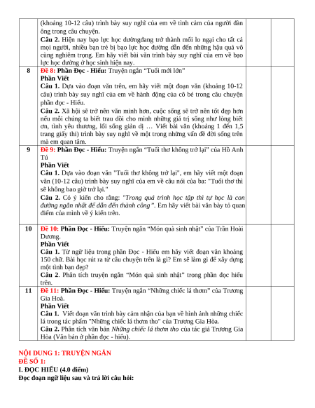 NỘI DUNG 1: TRUYỆN NGẮN ĐỀ SỐ 1: