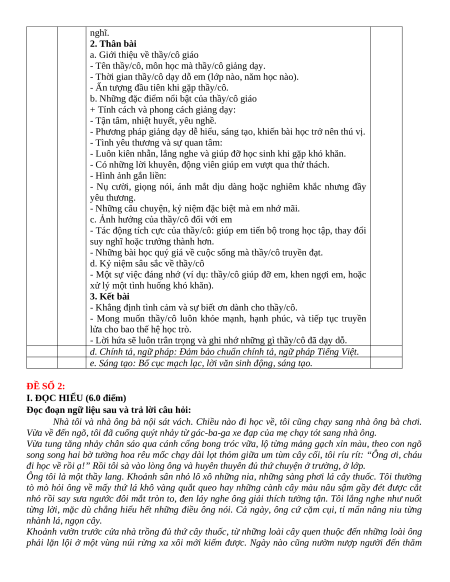 Câu 2 (4,0 điểm). Kí ức tuổi thơ chúng ta đều có những người thầy, người cô hết lòng dạy dỗ, yêu