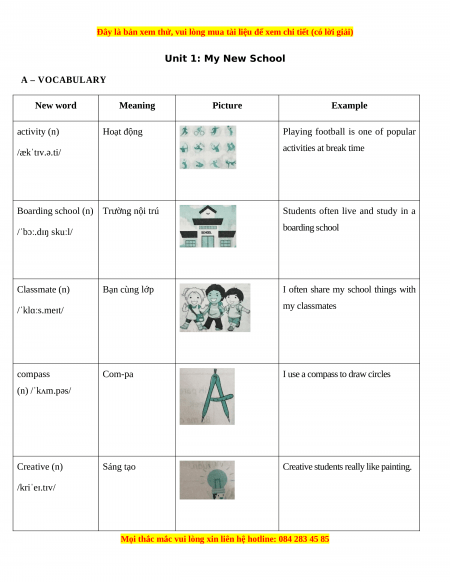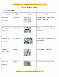 Unit 1: My New School A – VOCABULARY New word Meaning Picture Example activity (n) Hoạt động