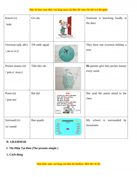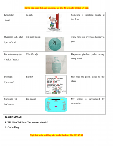 His parents give him pocket money /ˈpɒk.ɪt ˈmʌn.i/ every week. Poem (n) Bài thơ She read the poem aloud to the /ˈpoʊ.əm/ class. Surround (v) Bao quanh My school is surrounded by /səˈraʊnd/ mountains B- GRAMMAR