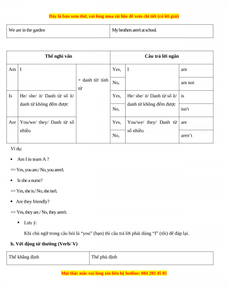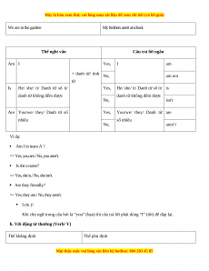 a. Với động từ “tobe” (am/ is/ are) Thể khẳng định Thể phủ định I am I am not He/ she/ it/ He/ she/ it/ Danh từ số ít/ Danh từ số ít/ is danh từ không
