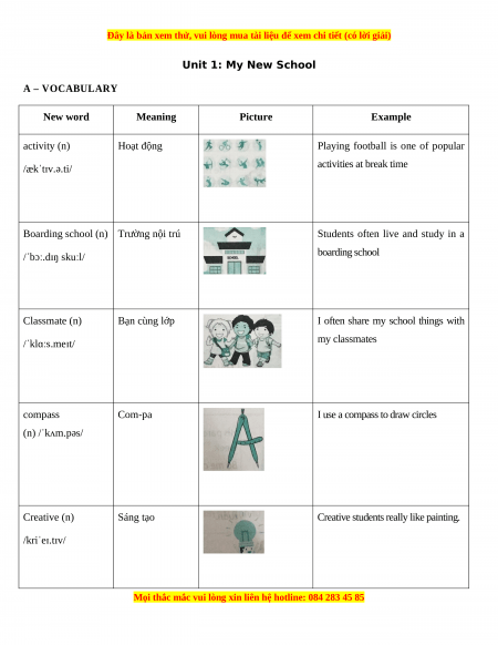 Unit 1: My New School A – VOCABULARY New word Meaning Picture Example activity (n) Hoạt động
