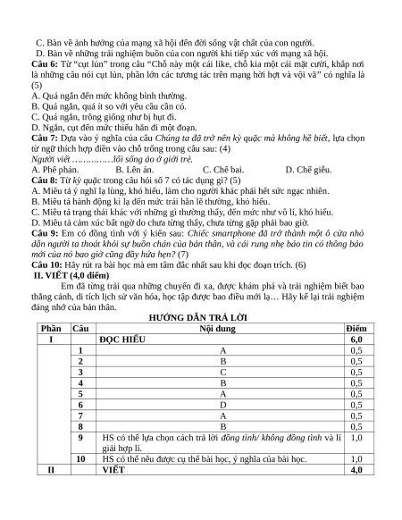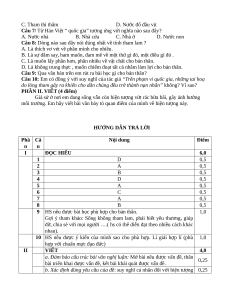 HƯỚNG DẪN TRẢ LỜI Phần Câu Nội dung Điểm I ĐỌC HIỂU 6,0 1 A 0,5 2 B 0,5 3 C 0,5 4 B 0,5 5 A 0,5 6 D 0,5 7 A 0,5 8 B 0,5 9
