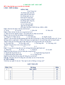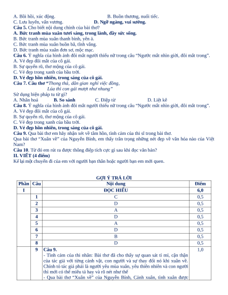 Kể lại một chuyến đi của em với người bạn thân hoặc người bạn em mới quen. GỢI Ý TRẢ LỜI Phần Câu Nội dung Điểm I ĐỌC HIỂU 6,0 1 C 0,5 2 D 0,5 3 A 0,5 4 D 0,5 5 A 0,5 6 D 0,5 7 B 0,5 8 D 0,5 9 Câu 9. 1,0
