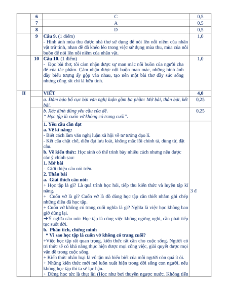 Trình bày suy nghĩ về câu nói: “Học tập là cuốn vở không có trang cuối” GỢI Ý TRẢ LỜI Phần Câu Nội dung Điểm I ĐỌC HIỂU 6,0 1 D 0,5 2 D 0,5 3 B 0,5 4 A 0,5 5 A 0,5 6 C 0,5 7 A 0,5 8 D 0,5 9 Câu 9. (1 điểm) 1,0