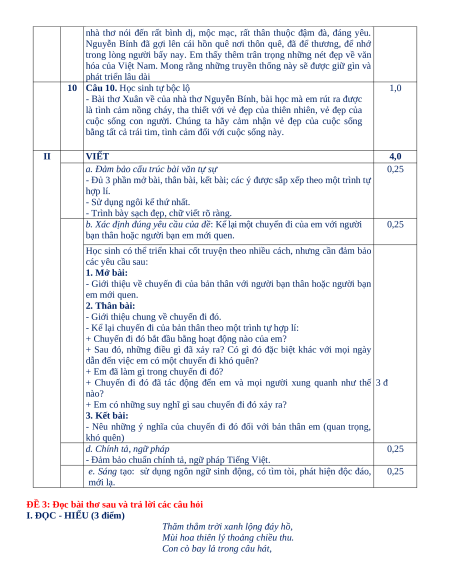 ĐỀ 2: Đọc bài thơ sau và trả lời các câu hỏi