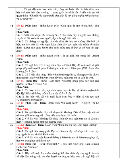 Đề 48: Phần Đọc - Hiểu: Đoạn trích của Trần Thị Lệ Quyên Phần Viết: