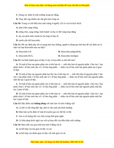Câu 10: Trong cơ chế điều hòa sinh trứng ở người, LH có vai trò kích thích