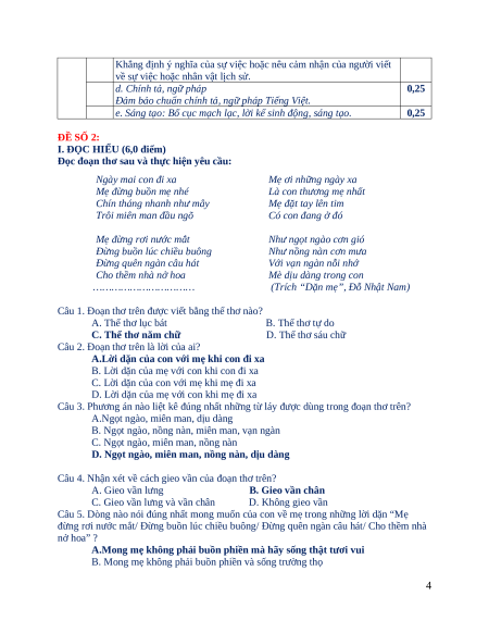 e. Sáng tạo: Bố cục mạch lạc, lời kể sinh động, sáng tạo. 0,25 ĐỀ SỐ 2: I. ĐỌC HIỂU (6,0 điểm)