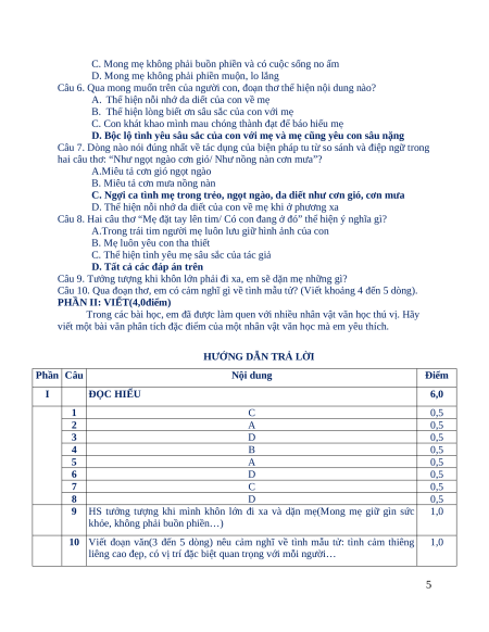HƯỚNG DẪN TRẢ LỜI Phần Câu Nội dung Điểm I ĐỌC HIỂU 6,0 1 C 0,5 2 B 0,5 3 A 0,5 4 D 0,5 5 D 0,5 6 D 0,5 7 A 0,5 8 A 0,5 9