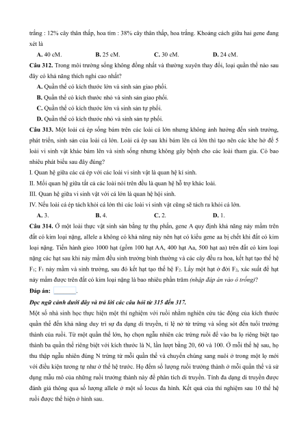 Câu 311. Để xác định khoảng cách giữa hai gene phục vụ việc lập bản đồ di truyền ở một loài thực