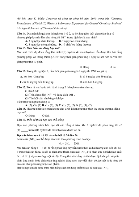 Câu 17. Tóm tắt các bước tiến hành trong 2 thí nghiệm trên như sau: (1) Đo CNF. (2) Trộn dung dịch 2 Ni và dung dịch – OH .