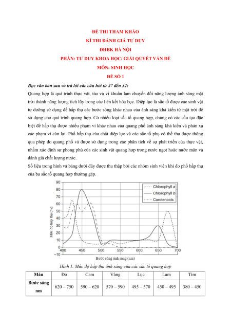 PHẦN: TƯ DUY KHOA HỌC/ GIẢI QUYẾT VẤN ĐỀ MÔN: SINH HỌC ĐỀ SỐ 1