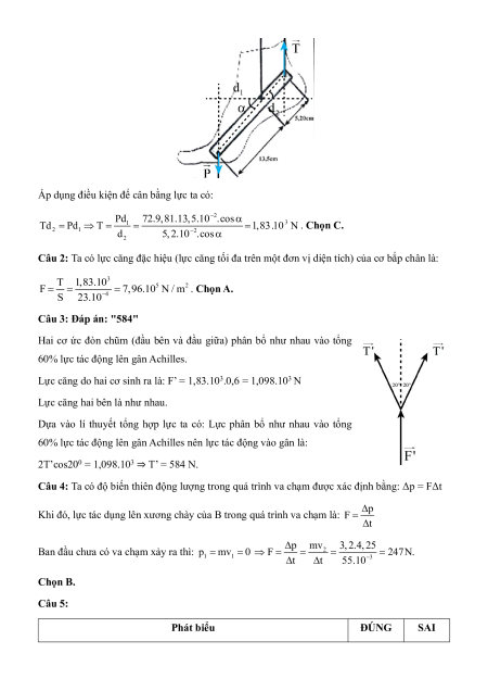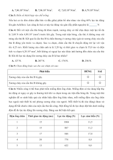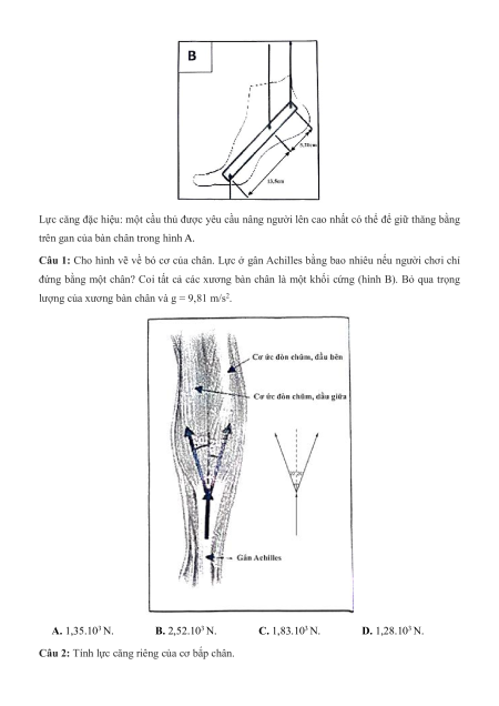 Câu 2: Tính lực căng riêng của cơ bắp chân. A. 7,96.105 N/m2. B. 7,96.103 N/m2. C. 7,65.105 N/m2. D. 6,79.105 N/m2.