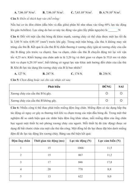 Câu 4: Đối với một cầu thủ bóng đá khỏe mạnh, xương chày có thể chịu được một lực tối đa