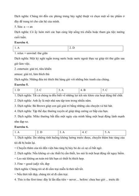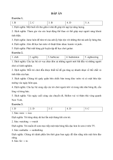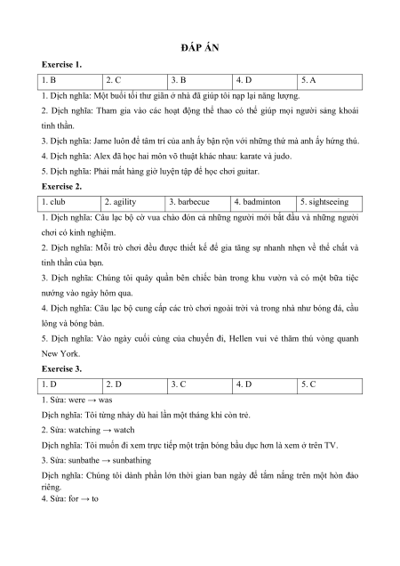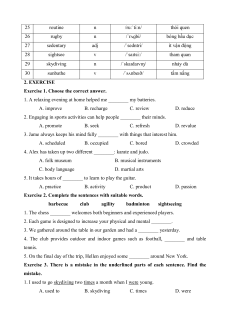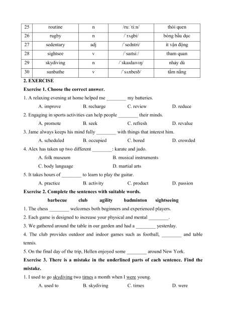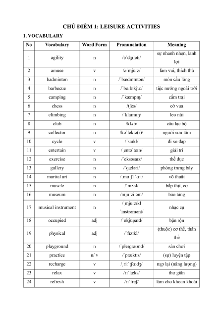 CHỦ ĐIỂM 1: LEISURE ACTIVITIES 1. VOCABULARY No Vocabulary Word Form Pronunciation Meaning sự nhanh nhẹn, lanh 1 agility n /əˈdʒɪləti/ lợi 2 amuse v /əˈmjuːz/ làm vui, thích thú 3 badminton n /ˈbædmɪntən/ môn cầu lông 4 barbecue n /ˈbɑːbɪkjuː/ tiệc nướng ngoài trời 5 camping n /ˈkæmpɪŋ/ cắm trại 6 chess n /tʃes/ cờ vua 7 climbing n /ˈklaɪmɪŋ/ leo núi 8 club n /klʌb/ câu lạc bộ 9 collector n /kəˈlektə(r)/ người sưu tầm 10 cycle v /ˈsaɪkl/ đi xe đạp 11 entertain v /ˌentəˈteɪn/ giải trí 12 exercise n /ˈeksəsaɪz/ thể dục 13 gallery n /ˈɡæləri/ phòng trưng bày 14 martial art n /ˌmɑːʃl ˈɑːt/ võ thuật 15 muscle n /ˈmʌsl/ bắp thịt, cơ 16 museum n /mjuˈziːəm/ bảo tàng /ˌmjuːzɪkl 17 musical instrument n nhạc cụ ˈɪnstrəmənt/ 18 occupied adj /ˈɒkjupaɪd/ bận rộn (thuộc) cơ thể, thân 19 physical adj /ˈfɪzɪkl/ thể 20 playground n /ˈpleɪɡraʊnd/ sân chơi 21 practice n/ v /ˈpræktɪs/ (sự) luyện tập 22 recharge v /ˌriːˈtʃɑːdʒ/ nạp lại (năng lượng) 23 relax v /rɪˈlæks/ thư giãn 24 refresh v /rɪˈfreʃ/ làm cho khoan khoái 25 routine n /ruːˈtiːn/ thói quen 26 rugby n /ˈrʌɡbi/ bóng bầu dục 27 sedentary adj /ˈsedntri/ ít vận động 28 sightsee v /ˈsaɪtsiː/ tham quan 29 skydiving n /ˈskaɪdaɪvɪŋ/ nhảy dù 30 sunbathe v /ˈsʌnbeɪð/ tắm nắng 2. EXERCISE