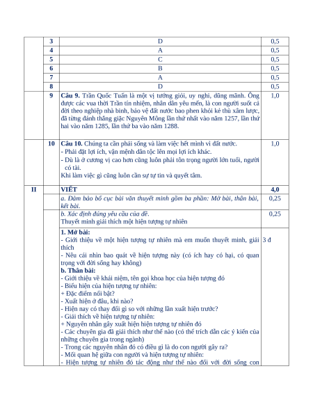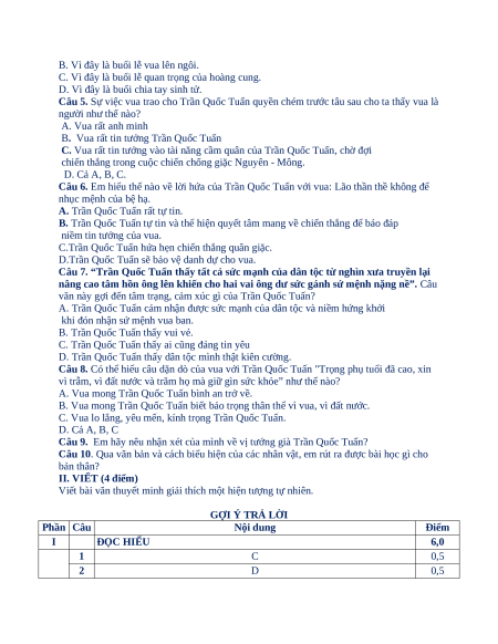 Viết bài văn thuyết minh giải thích một hiện tượng tự nhiên. GỢI Ý TRẢ LỜI Phần Câu Nội dung Điểm I ĐỌC HIỂU 6,0 1 C 0,5 2 D 0,5 3 D 0,5 4 A 0,5 5 C 0,5 6 B 0,5 7 A 0,5 8 D 0,5 9