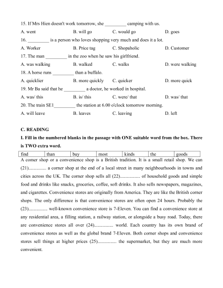 20. The train SE1_________ the station at 6.00 o'clock tomorrow morning. A. will leave B. leaves C. leaving D. left C. READING