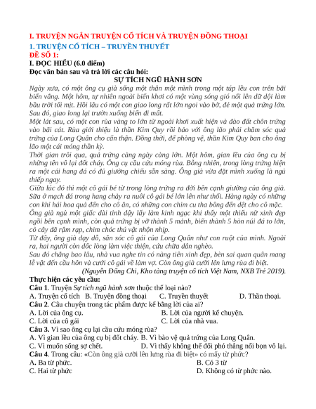 1. TRUYỆN CỔ TÍCH – TRUYỀN THUYẾT ĐỀ SỐ 1: I. ĐỌC HIỂU (6.0 điểm)