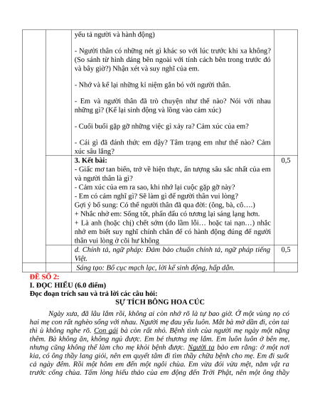 Sáng tạo: Bố cục mạch lạc, lời kể sinh động, hấp dẫn. ĐỀ SỐ 2: I. ĐỌC HIỂU (6.0 điểm)