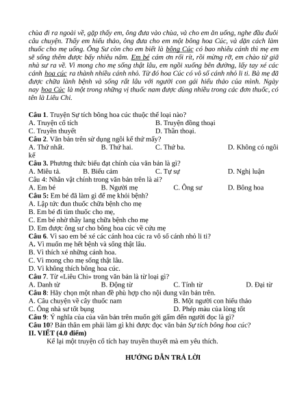 HƯỚNG DẪN TRẢ LỜI Phần Câu Nội dung Điểm I ĐỌC HIỂU 6,0 1 C 0,5 2 B 0,5 3 B 0,5 4 C 0,5 5 D 0,5 6 C 0,5 7 A 0,5 8 B 0,5 9