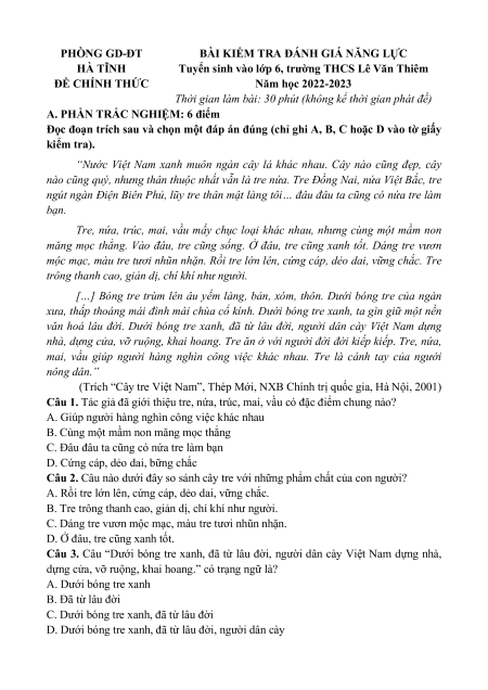 Tuyển sinh vào lớp 6, trường THCS Lê Văn Thiêm ĐỀ CHÍNH THỨC Năm học 2022-2023