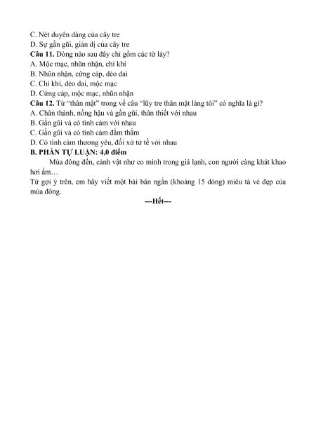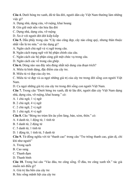 Câu 9. Từ đồng nghĩa với từ “thanh cao” trong câu “Tre trông thanh cao, giản dị, chí khí như người” A. Trong sạch B. Cao sang C. Thanh đạm D. Thanh bình