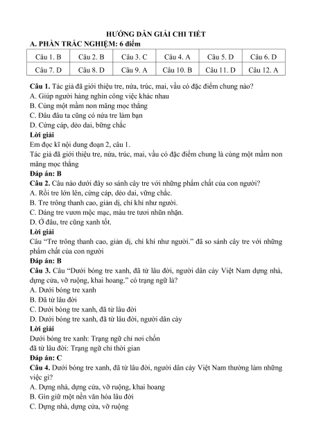 A. PHẦN TRẮC NGHIỆM: 6 điểm Câu 1. B Câu 2. B Câu 3. C Câu 4. A Câu 5. D Câu 6. D Câu 7. D Câu 8. D Câu 9. A Câu 10. B Câu 11. D Câu 12. A