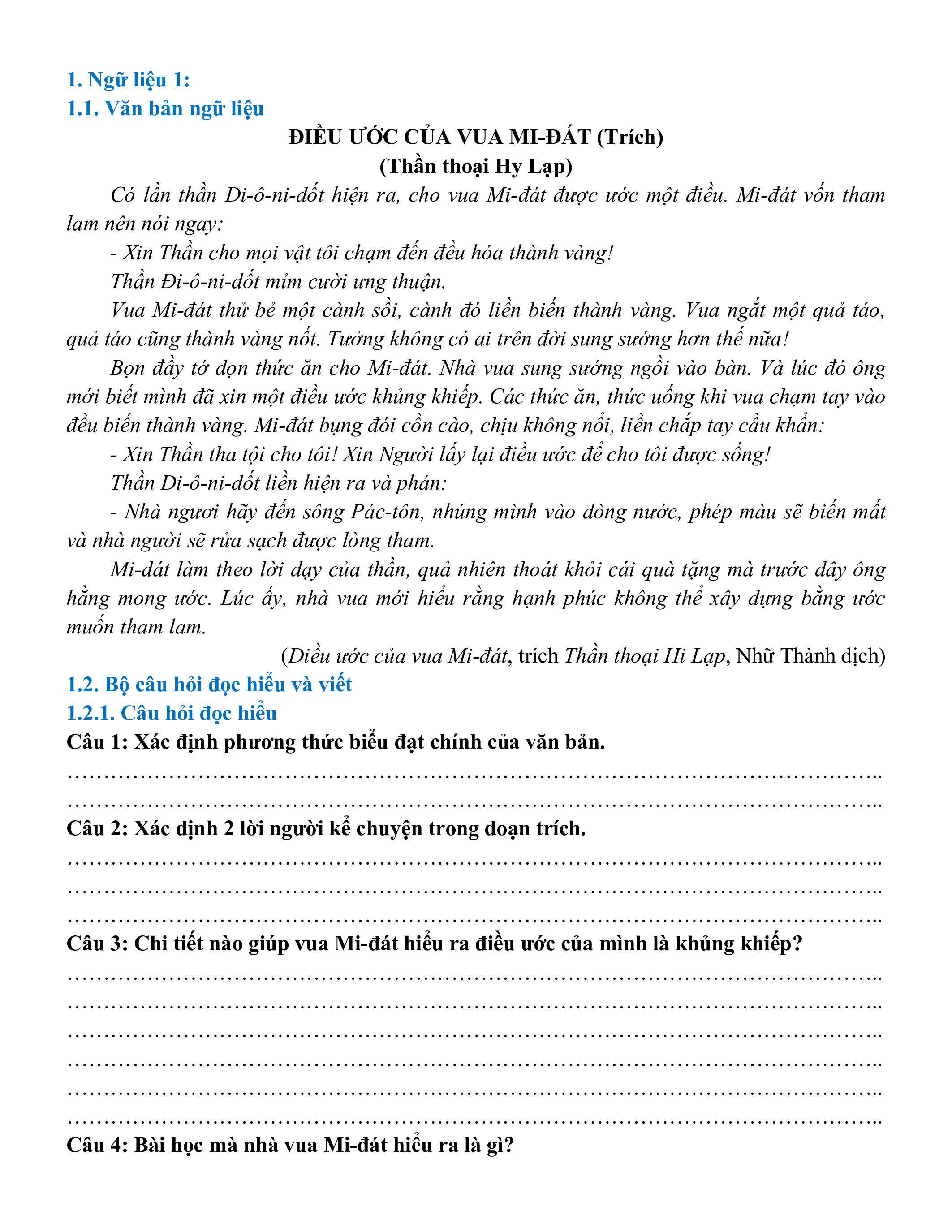 Câu 1: Từ ngữ liệu “Điều ước của vua Mi-đát” (Thần thoại Hy Lạp), hãy viết một đoạn