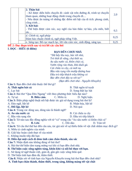 ĐỀ 2: Đọc đoạn trích sau và trả lời các câu hỏi I. ĐỌC - HIỂU (6 điểm) BẠN ĐẾN CHƠI NHÀ