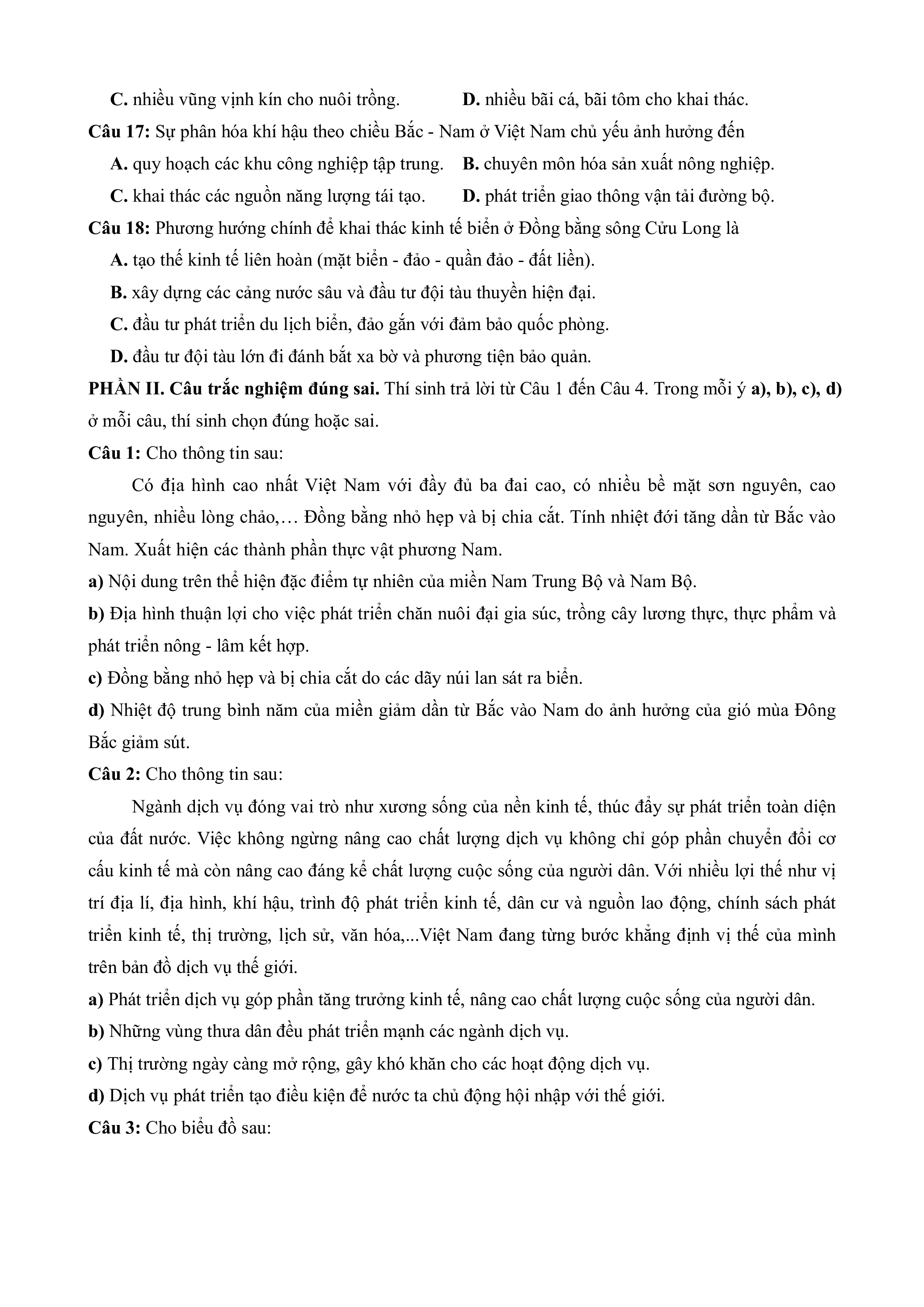 Câu 18: Phương hướng chính để khai thác kinh tế biển ở Đồng bằng sông Cửu Long là